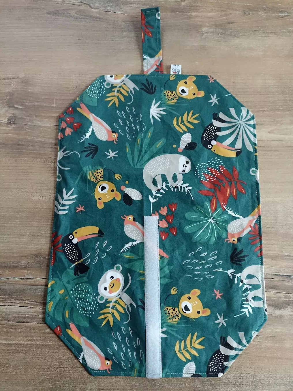 Tissu enduit face extérieure – PUL (tissu imperméable spécial contact alimentaire) face intérieure – velcro.
